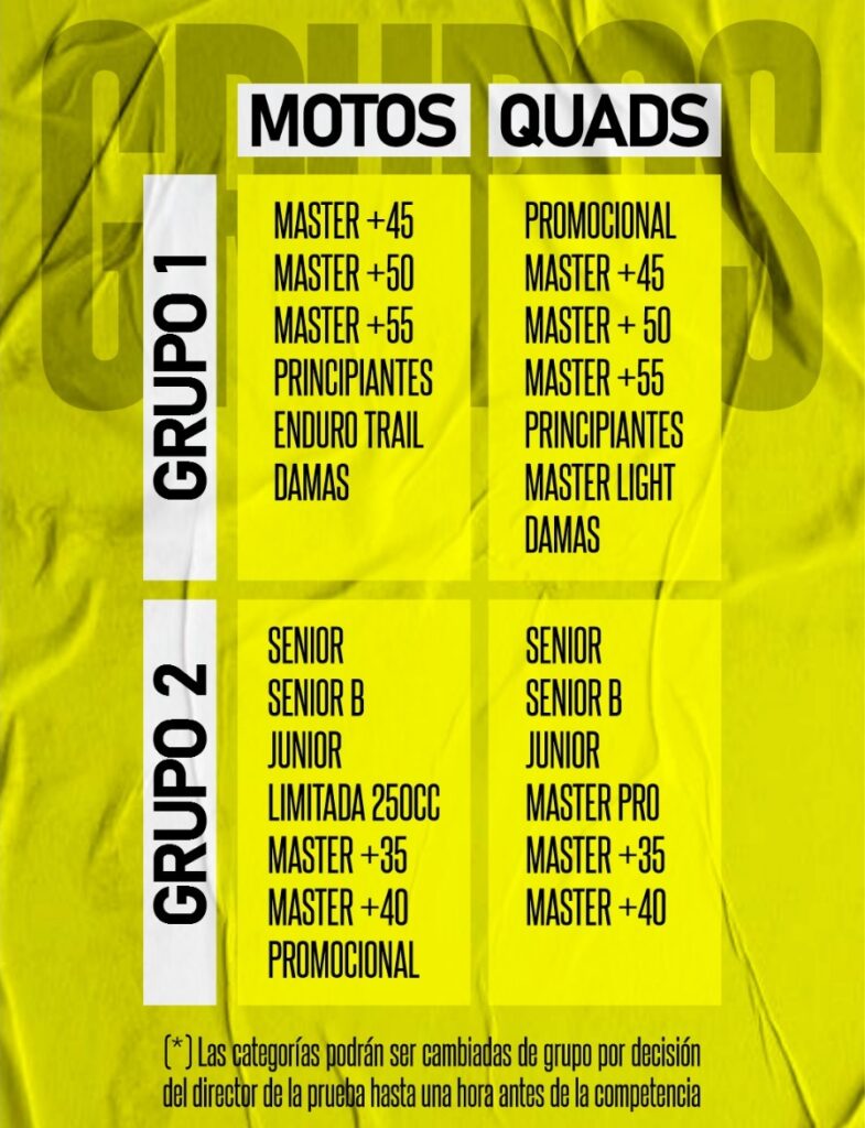 Se realizarán la exhibición Mini Quads, una carrera de Atv´s 250cc de 30 minutos; y dos carreras de Motos y otras dos de Atv´s divididas en grupo 1 y grupo 2 como se detalla en el siguiente cuadro; estas se disputarán con una duración en tiempo aproximado de 45 minutos y se expresarán en un número determinado de vueltas, las cuales se establecerán por el Jurado de la Prueba hasta una hora antes de la competencia, en función de los tiempos del día sábado.